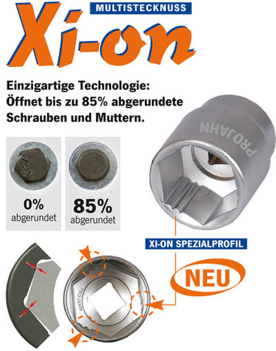 Selbst bis zu 85 % abgerundete Schrauben und Muttern können durch das revolutionäre Xi-on Spezialprofil im Innern der Nuss geöffnet werden. Das gab's noch nie! Lassen Sie sich überzeugen und testen Sie das Multitalent von PROJAHN.