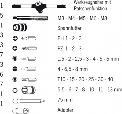 Werkzeughalter mit Ratschenfunktion M3 · M4 · M5 · M6 · M8 Spannfutter Ø 5,5 · 6 · 7 · 8 · 10 · 11 · 13 mm Verlängerung 75 mm Adapter PH 1 · 2 · 3 PZ 1 · 2 · 3 1,5 · 2 · 2,5 · 3 · 4 · 5 · 6 mm 4 · 6,5 · 8 mm T10 • 15 • 20 • 25 • 30 • 40