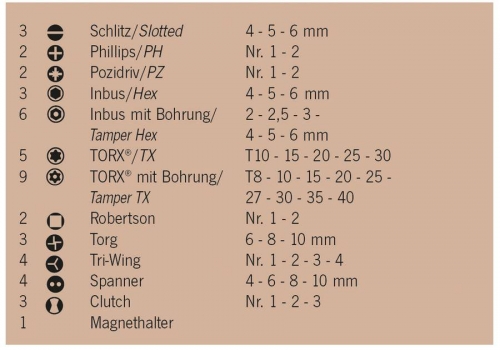 • 5 Torx-Bits T10 - 15 - 20 -25 - 27 - 30 - 35 - 40