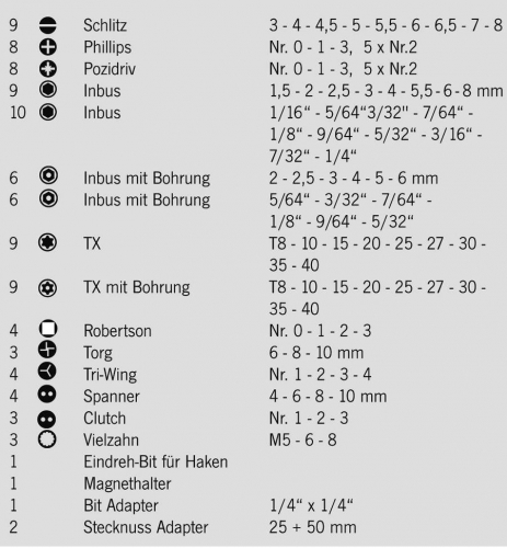• 9 Inbus-Bits 1,5 - 2 - 2,5 - 3 - 4 - 5,5 - 6 - 8 mm