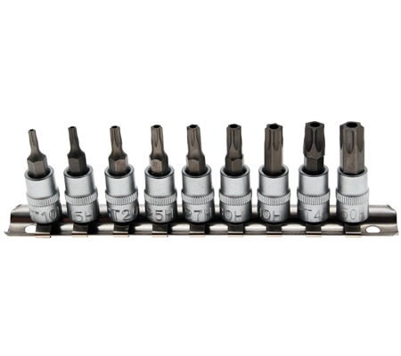 • Schraubendreheinsätze, Antrieb Innenvierkant 6,3 mm (1/4"), Abtrieb T-Profil (für Torx) mit Bohrung: T10 - T15 - T20 - T25 - T27 - T30 - T40 - T45 - T50