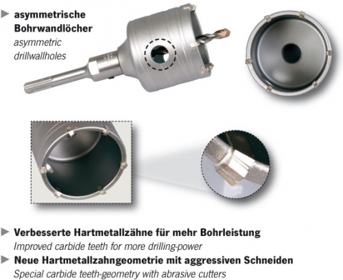 • Die leichte Bauart dieser Hammerbohrkrone hat den Anwendungsbereich der SDS-plus Bohrhämmer der Klasse bis 4 kg, sowie der schweren Schlagbohrmaschinen wesentlich erweitert