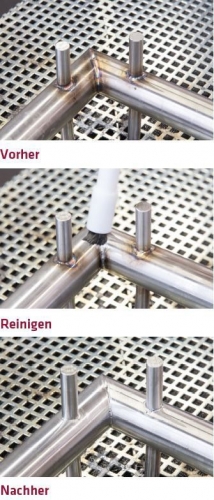 Im Zuge der Bearbeitung von Edelstahl-Oberflächen sind mit dem CleanMaster RW schwer zugängliche Ecken und Kanten einfacher erreichbar. So steigert schnelle Reinigungsleistung mit gleichzeitiger Passivierung die Produktivität der Edelstahlverarbeitenden Gewerbe- und Industriekunden. Dabei wird der Einsatz gefährlicher Chemikalien, die Flusssäure wie Beizpaste enthalten unnötig.