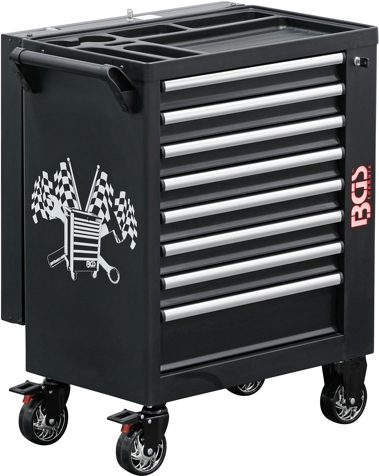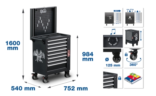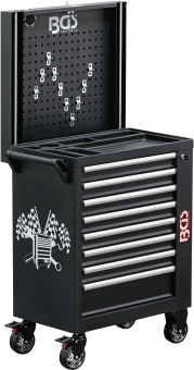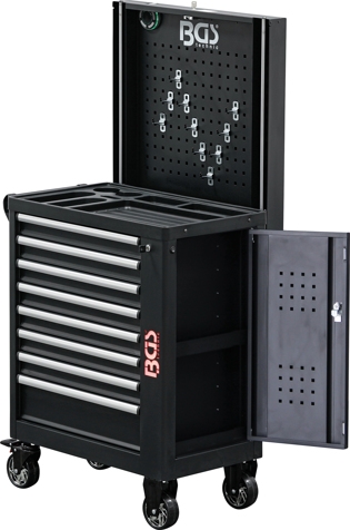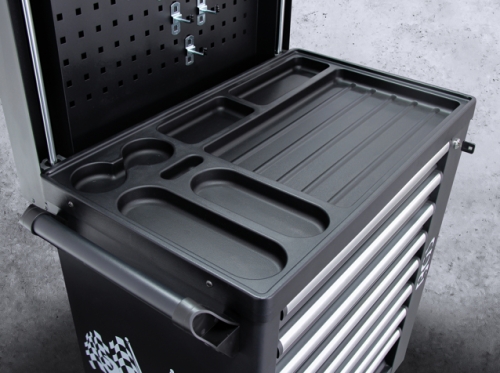 im Seitenschrank befinden sich 2 Ablagefächer für Spraydosen, Werkzeuge und Flaschen, sowie eine Lochwand im schwenkbaren Türelement zur Montage von Haken für Werkzeuge