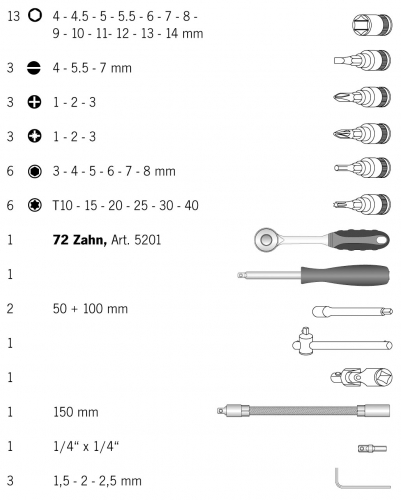 • 1 Umschaltknarre 6,3 / 1/4" 72 Zähne