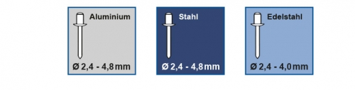 • Spannbacken aus gehärtetem Legierungsstahl – Für alle Blindniet-Materialien geeignet