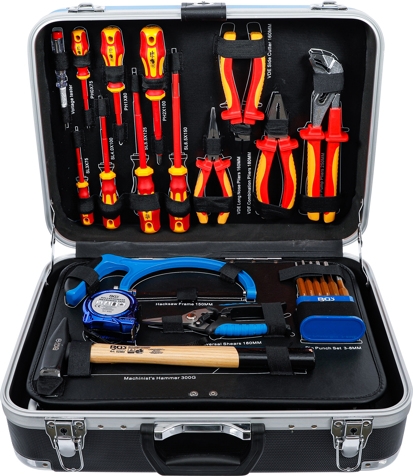 • Steckschlüssel-Einsätze, Umschaltknarre, VDE-Zangen, VDE-Schraubendreher, Splintentreiber und Doppel-Maulschlüssel gefertigt aus Chrom-Vanadium Stahl