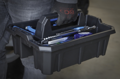 offener Tragekasten mit zwei großen Einzelfächern zum Transport von Werkzeugen und Kleinteilen