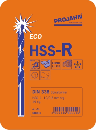 Inhalt:19 kurze Spiralbohrer mit Zylinderschaft HSS-R nach DIN 338 Typ N ECOje 1 Ø 1 – 10 mm um 0,5 steigend