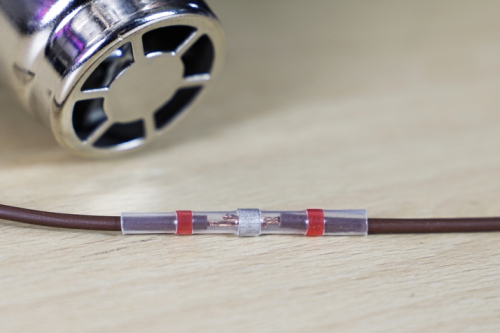• durch Erwärmen mit einem Heißluftgerät verbindet das Lötzinn im Innern dieser Isolierverbinder die Kabelenden