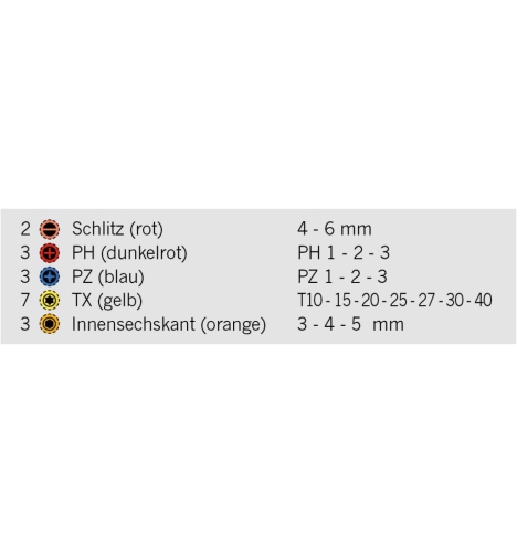 • Farbig markierte Bits erleichtern das Suchen der richtigen Größe und des gewünschten Antriebs.