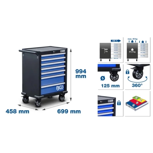 • hochbelastbare, kugelgelagerte Rollen, davon 2 feststellbare Lenkrollen