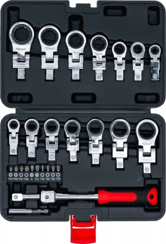 • Einsteck-Ratschenring-Schlüssel mit Gelenk und stufenlos abwinkelbaren Köpfen